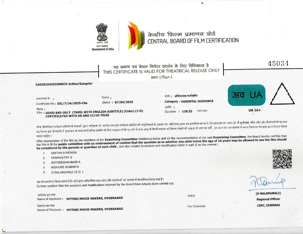 Crew: Adhik Ravichander (Director), Abinandhan Ramanujam (Director of Photography), GV Prakash Kumar (Music Director)