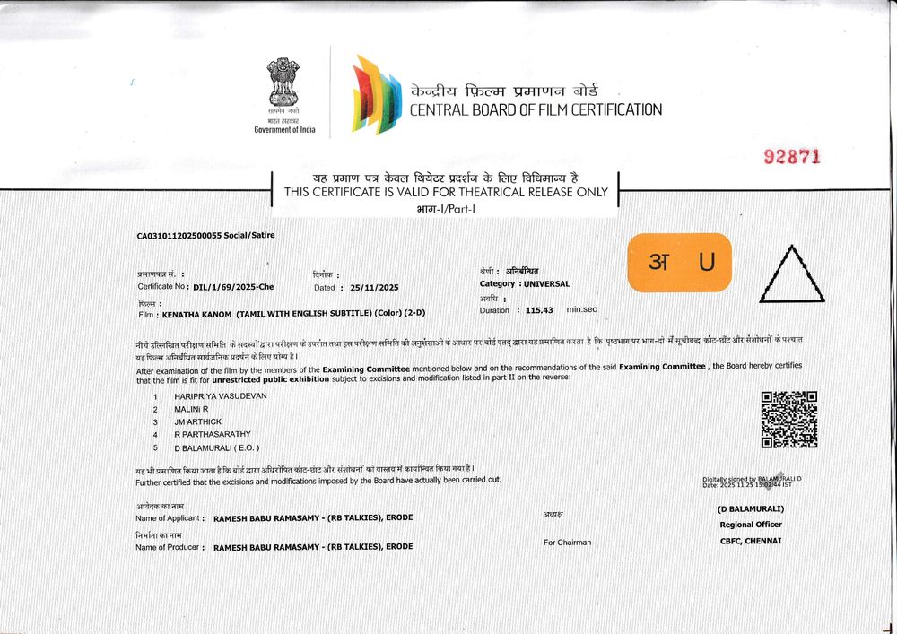 Crew: Suresh Sangaiah (Director), Thiyagarajan (Director of Photography), Nivas K Prasanna (Music Director)